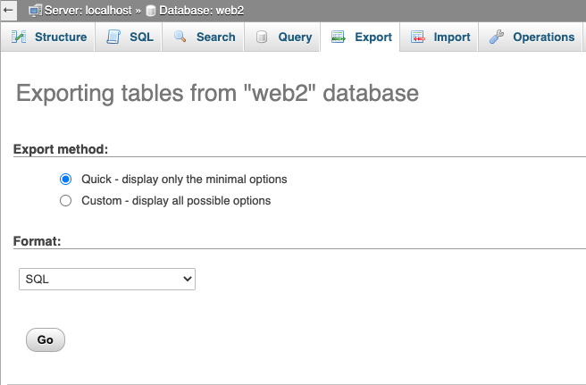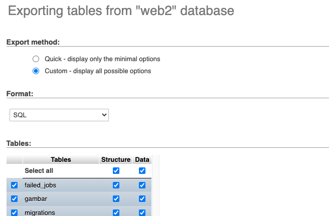 - Pilih Custom apabila ingin export data atau struktru database saja