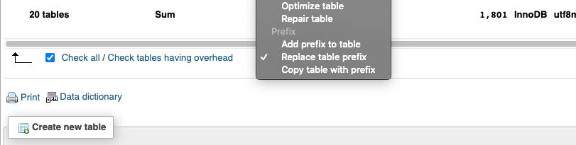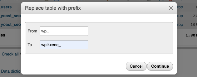 - Selanjutnya Check all tables lalu pilih Replace table prefix