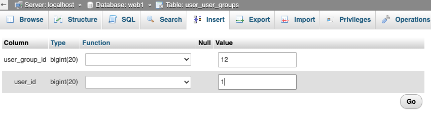 Selanjutnya masuk ke table user_user_groups lalu insert dengan value user_group_id=12, user_id=1