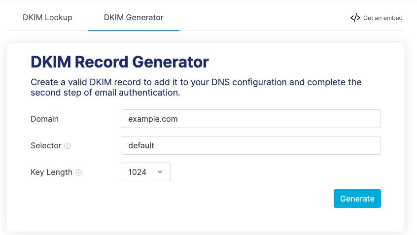 Generate DKIM juga bisa Anda lakukan melalui https://easydmarc.com/tools/dkim-record-generator