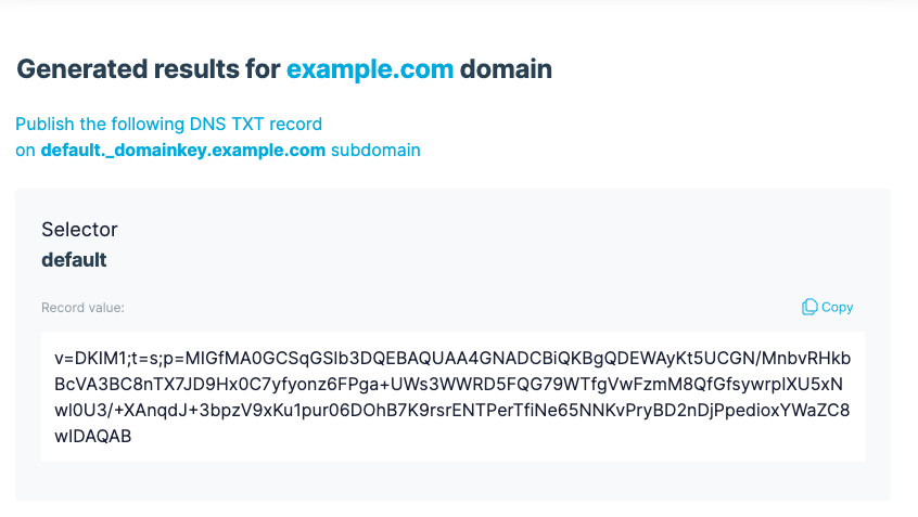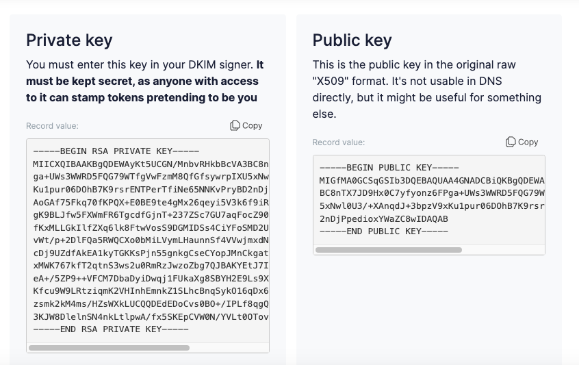 "v=DKIM1\; h=sha256\; t=s\; p=" "MIIBIjANBgkqhkiG9w0BAQEFAAOCAQ8AMIIBCgKCAQEAo.."Tambahkan record TXT tersebut ke domain Anda.