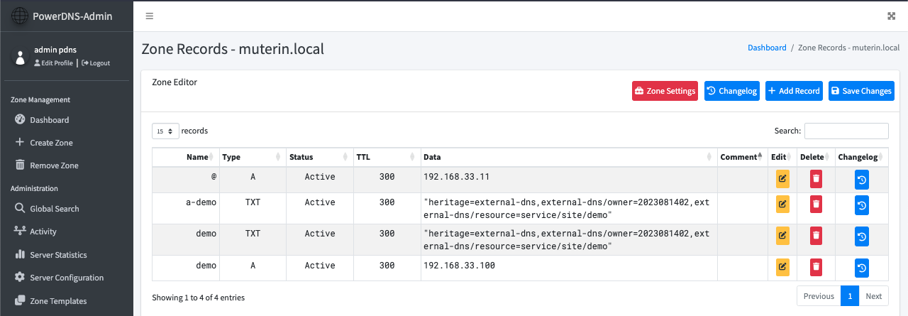 Tunggu sekitar 30 detik sampai 1 menit, lalu cek pada dashboard PowerDNS-Admin untuk memastikan record sudah berhasil dibuat.