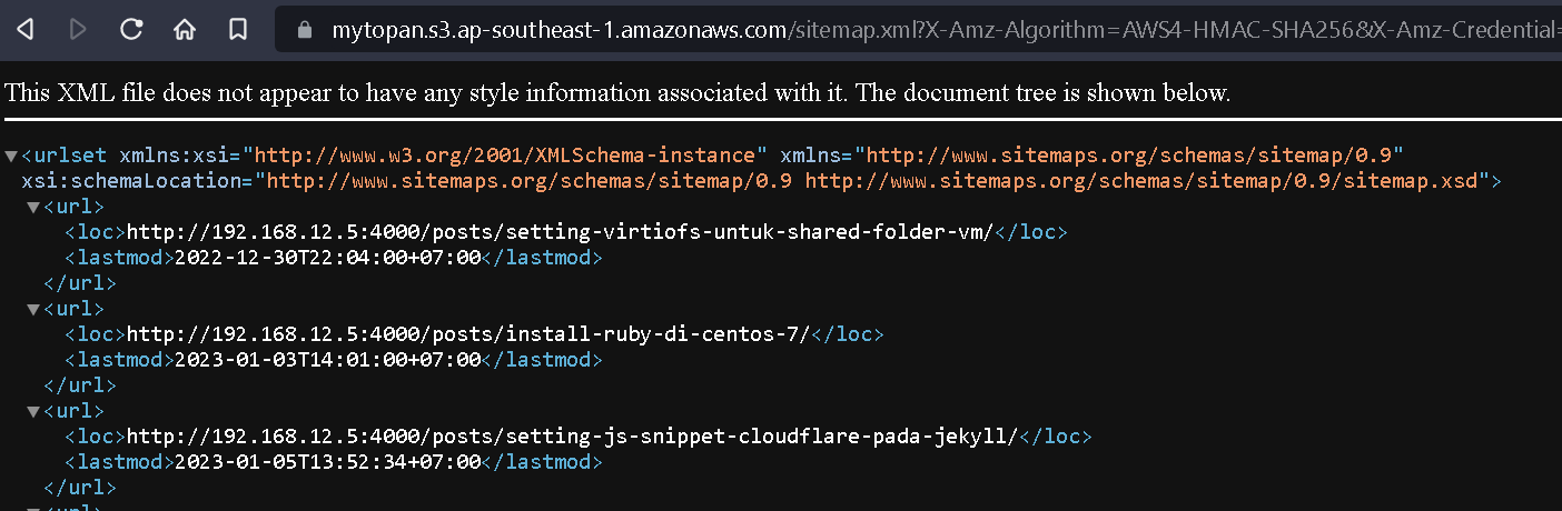 https://mytopan.s3.ap-southeast-1.amazonaws.com/sitemap.xml?X-Amz-Algorithm=AWS4-HMAC-SHA256&X-Amz-Credential=AKIAW66Z2DXXUHKAMGO6%2F20230109%2Fap-southeast-1%2Fs3%2Faws4_request&X-Amz-Date=20230109T074811Z&X-Amz-Expires=30&X-Amz-SignedHeaders=host&X-Amz-Signature=b6a143780a5e4c7932c71884f3e01146f84c4e0b158bd268332467d2b7c1208eNote: Jika option expires-in tidak ditentukan maka nilainya akan 3600 atau 1 Jam