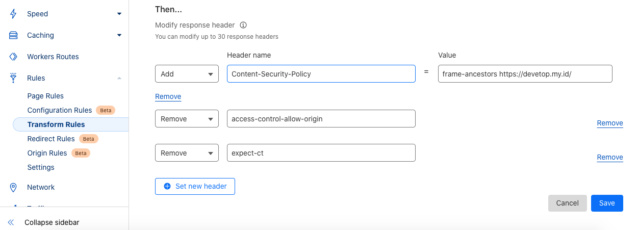 Rules > Transform Rules > Modify Response Header > Create Rule