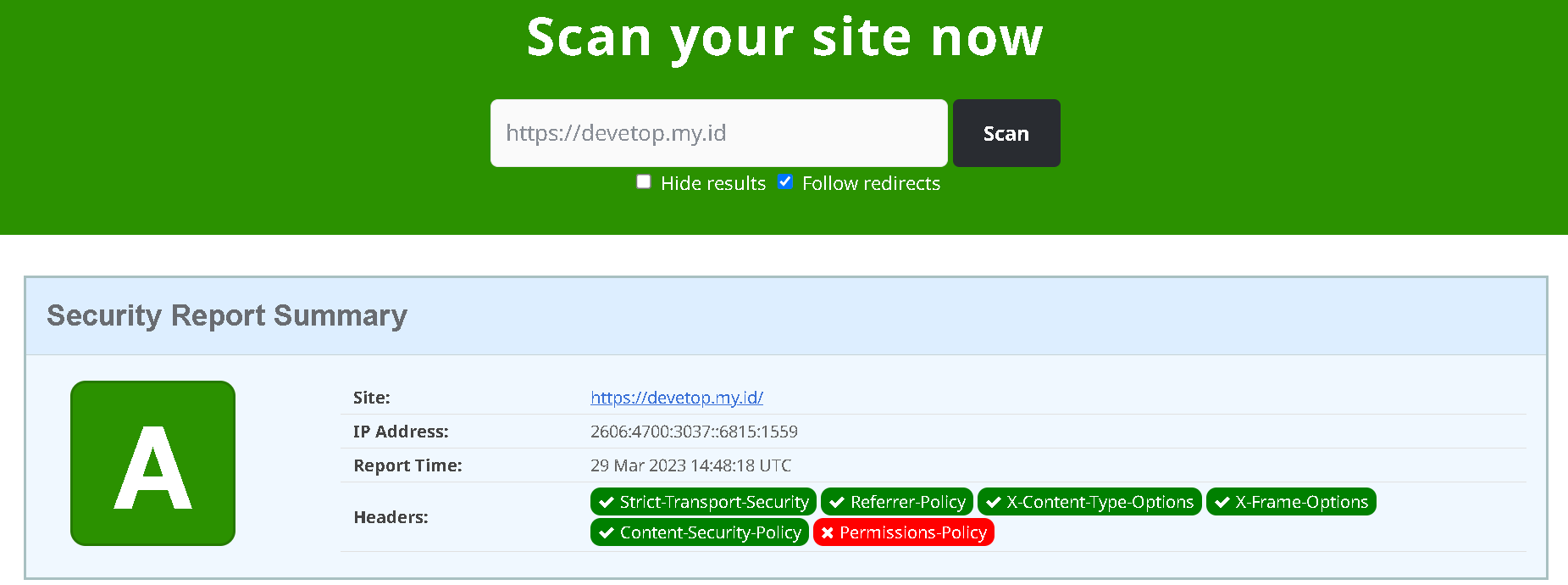 Untuk mengetahui skor security header pada website, Anda dapat scan secara online di securityheaders.com