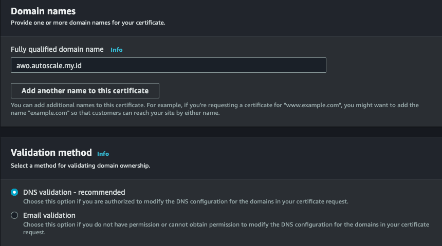 $ aws acm request-certificate --domain-name awo.autoscale.my.id --validation-method DNS