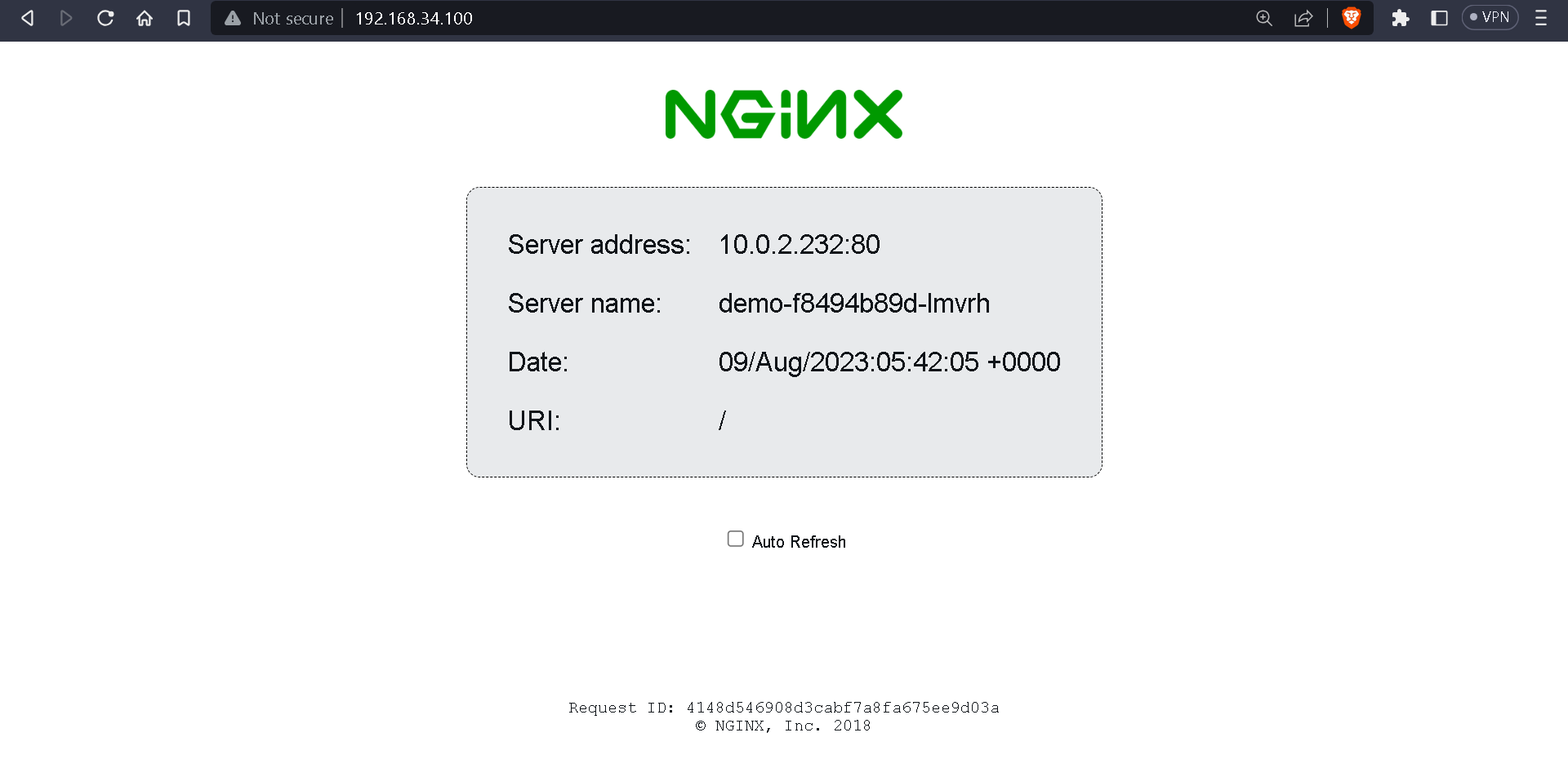 demo LoadBalancer 10.11.102.64 192.168.34.100 80:31797/TCP 5m18s
