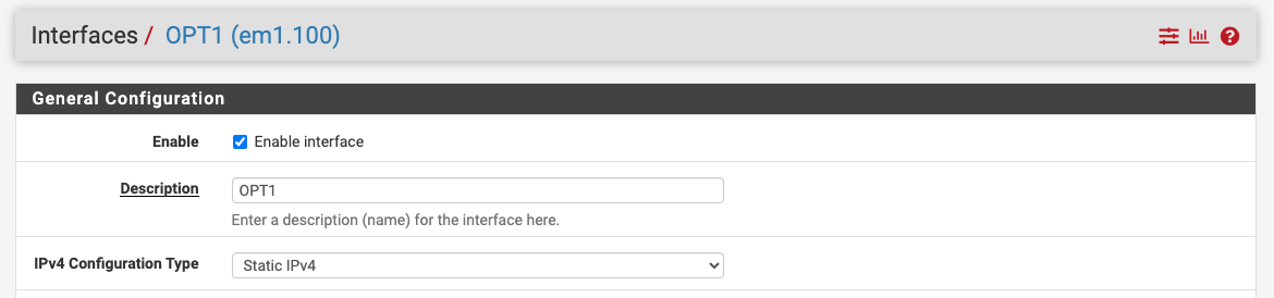 Selanjutnya arahkan ke Interfaces -> OPT1. Lalu Enable interface dan tentukan IP VLAN.